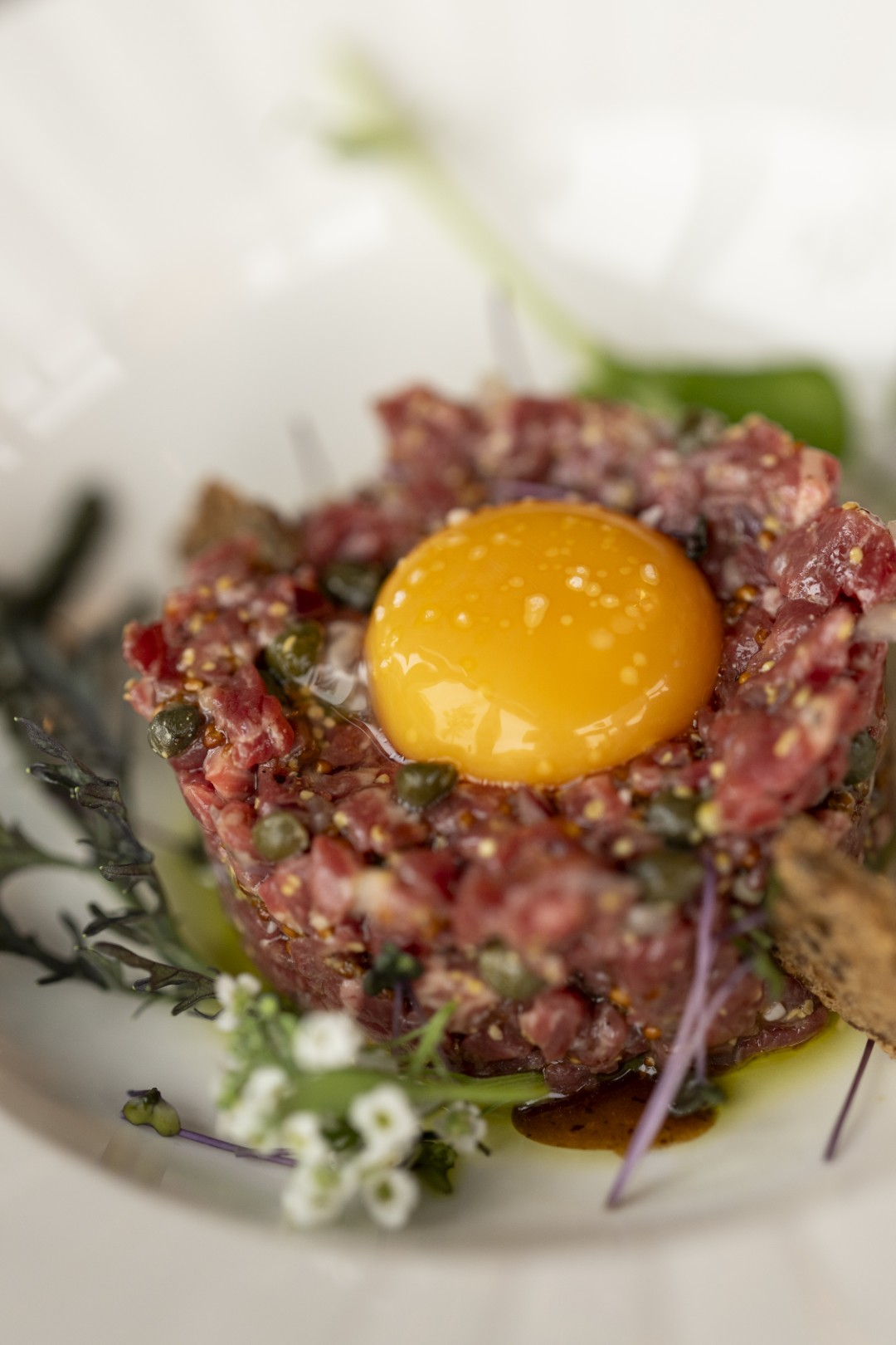 Traditional angus tartar with a little crunch topped with egg yolk
