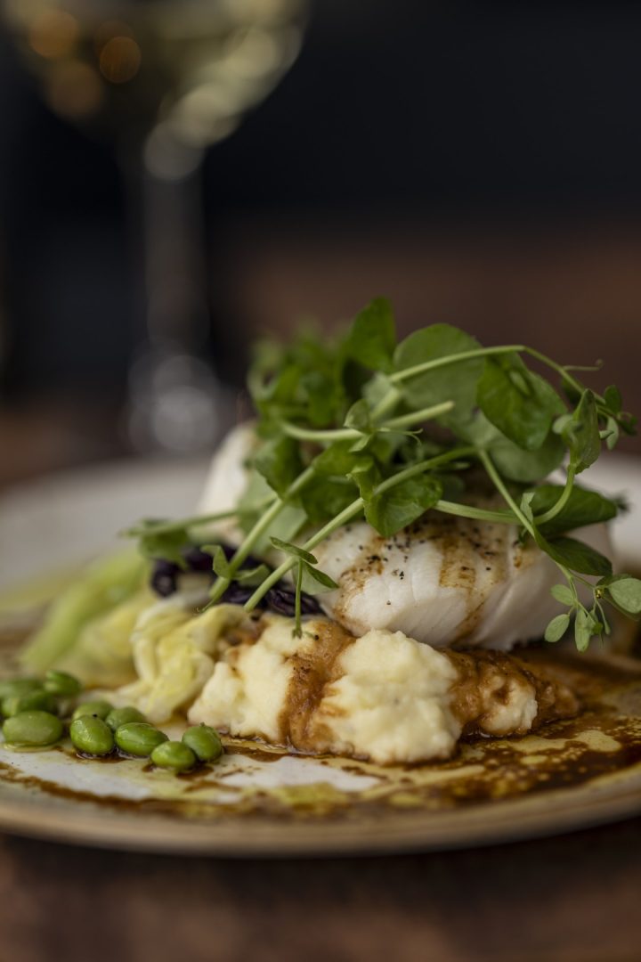 Browned soy butter, edamame beans, served on creamy mashed potatoes